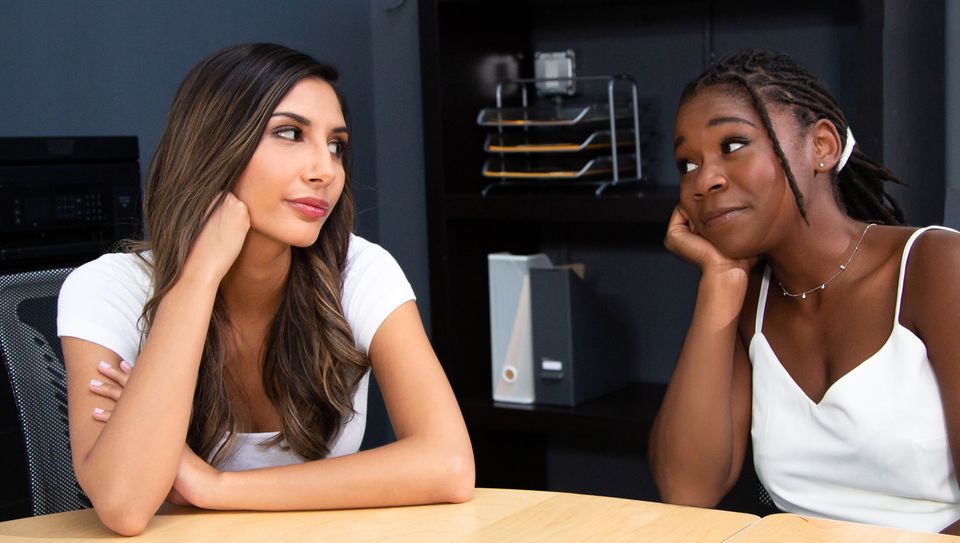 Hazel Grace and Gianna Dior, two teens, are bored out of their minds as they meet for the first time in an empty conference room. It's Bring Your Daughter To Work Day and they're both finally getting a break while their parents are stuck in yet another meeting.Although they're both feeling a bit grumpy from being dragged around all day, they're quick to bond over their shared boredom. In fact, as they begin casting each other flirty looks across the table, they can think of some fun ways to spice the day up. Sure, it's nearly time to clock out, but that doesn't mean they can't go out with a bang.They start by pulling their chairs close and sharing some steamy kisses, feeling bold and frisky. As the heat builds, Hazel's mischievous nature takes over as she slides beneath the table and begins eating Gianna's pussy out. Now all bets are off as they please each other to no end. Maybe it wasn't such a boring day after all!