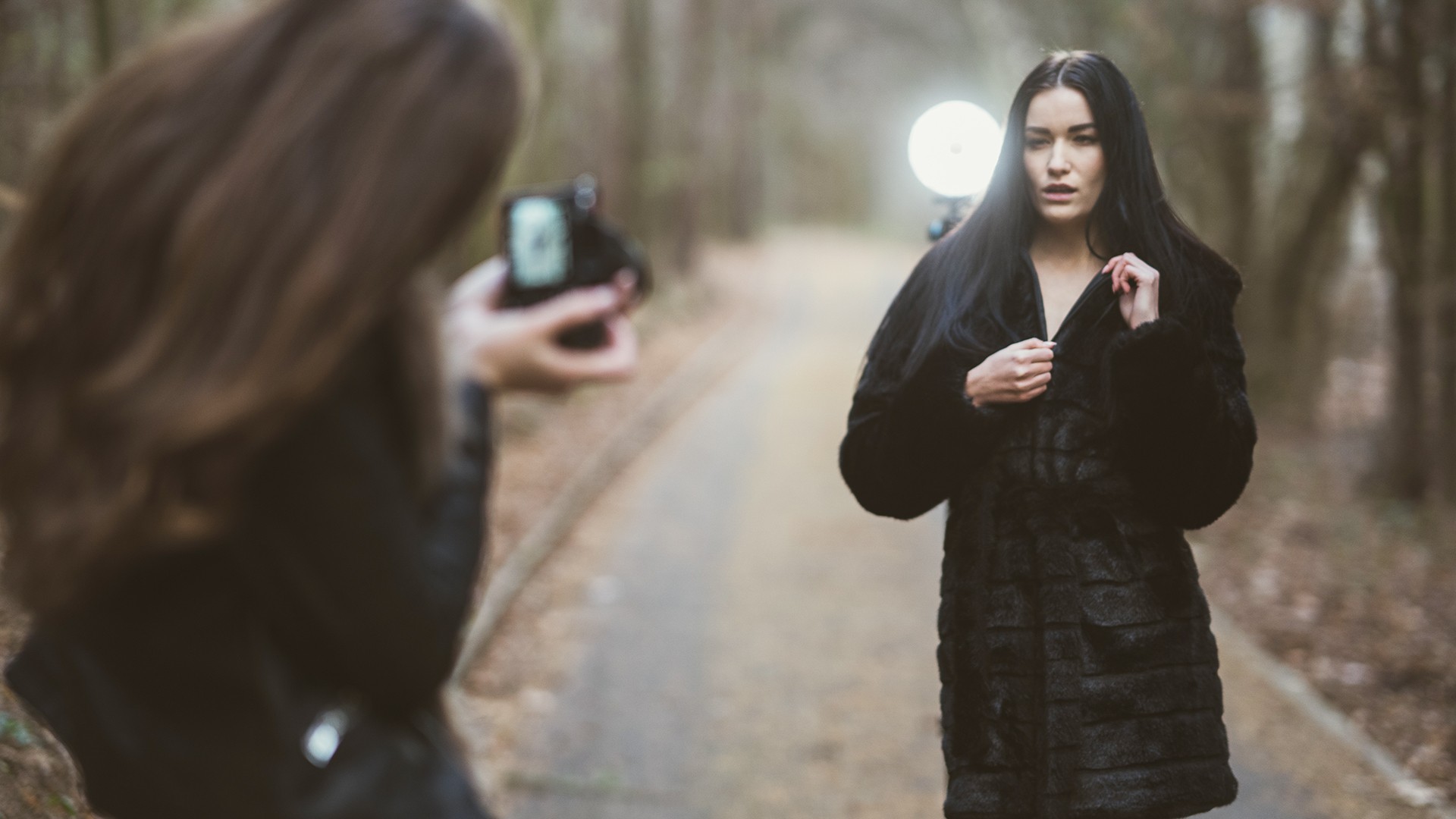 Photographer Stacy Cruz is taking pictures of petite model Elouisa in the woods, and as she snaps pics of the brunette's naked body, she feels herself getting turned on. Noticing Elouisa's hardening nipples, Stacy invites her model back to her studio so they can warm up. Once in the studio, things don't just warm up...they get hot! Stacy kisses the naked Elouisa, who plays with her boobs before sliding a hand down the front of her beige tights. Both ladies play with one another's titties and asses, before fingering each other to orgasm!